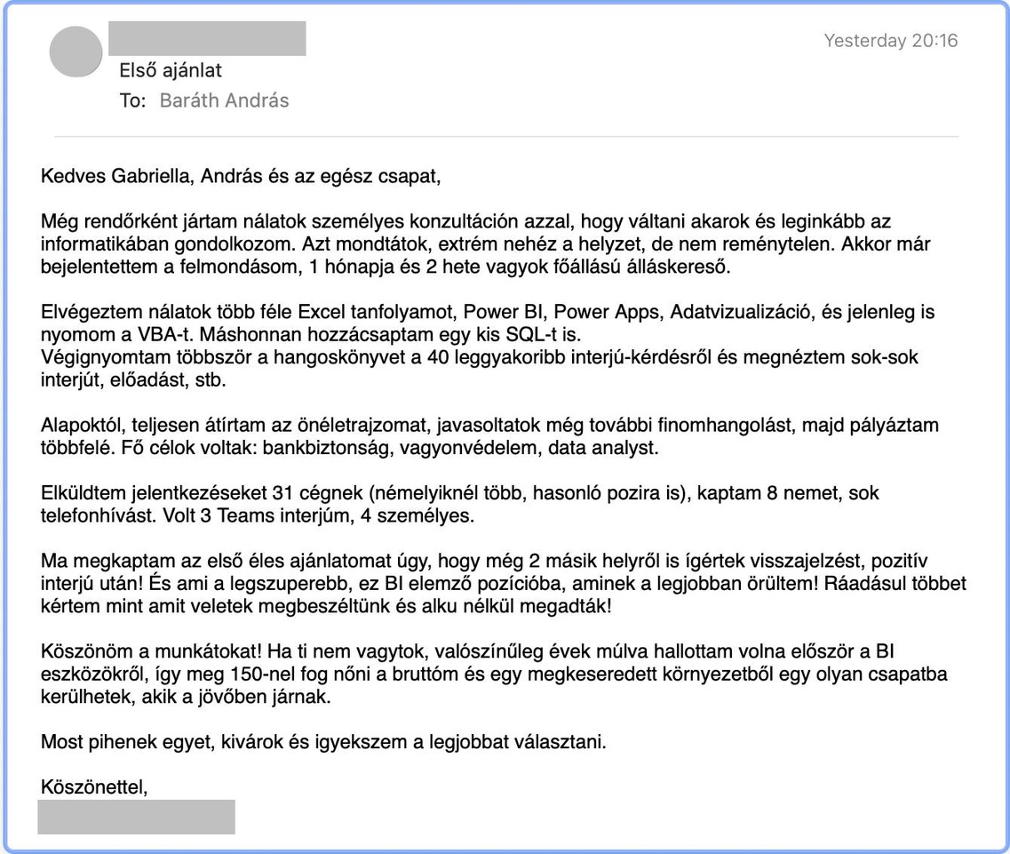 Nézd, nem ismerlek személyesen, de azt tudom, hogy már több, mint 7000-en tanulnak nálunk, és ez nem véletlen. Nincs olyan hét, hogy ne jönne egy pozitív visszajelzés, egy sikersztori ügyfeleinktől. Ha végignézed a zárt Facebook csoportot, ott is fogsz találni bőven visszajelzéseket. Íme egy levél a közelmúltból: